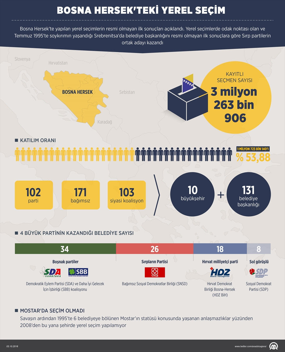 SARAYBOSNA (AA) - Bosna Hersek'te yapılan yerel seçimlerin resmi olmayan ilk sonuçları açıklandı.