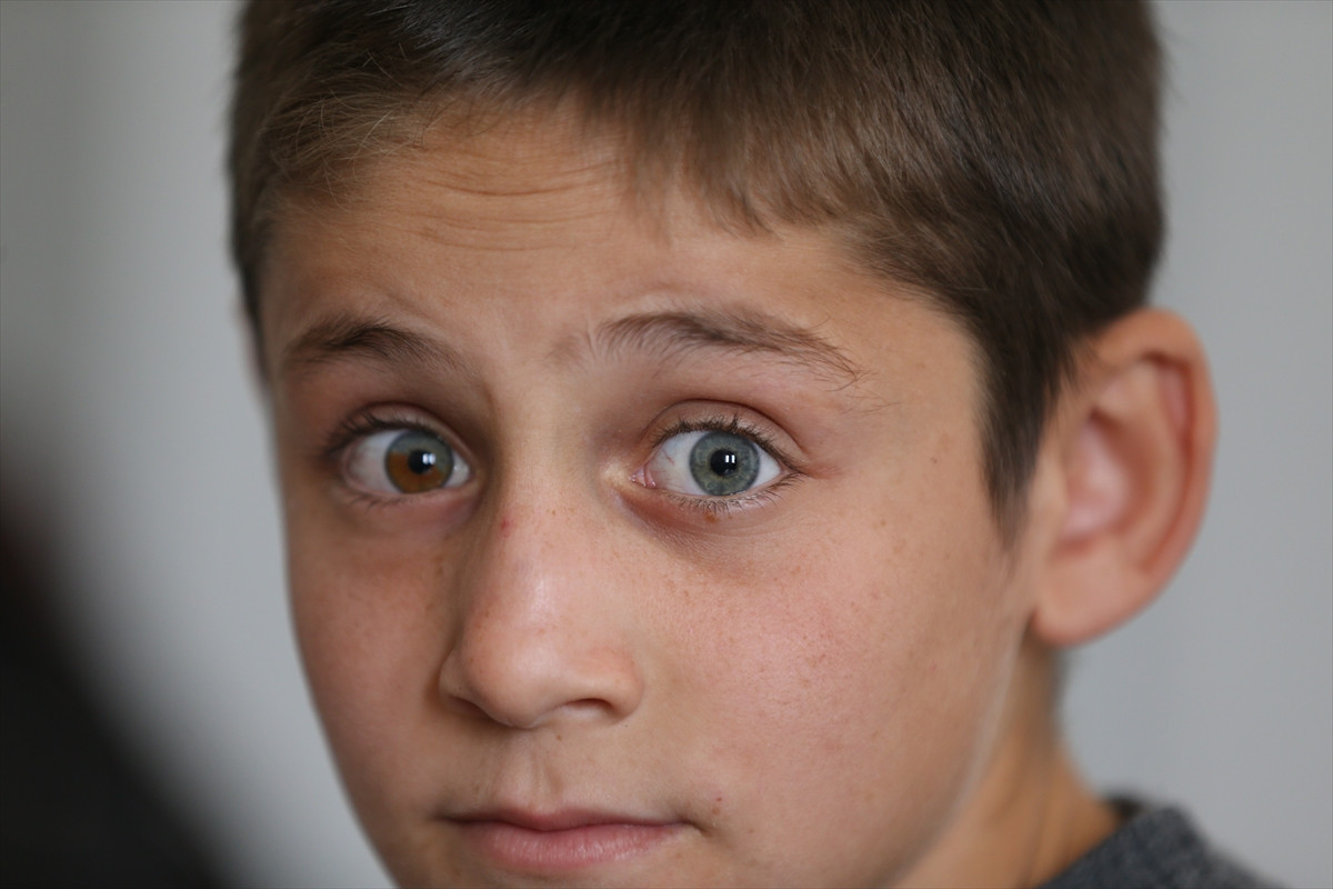 HATAY (AA) - Suriye'deki olaylar nedeniyle ailesiyle Hatay'ın Reyhanlı ilçesine sığınan 12 yaşındaki Suriyeli Hamadi Ahmet'in gözlerinin birinin tamamen mavi, diğerinin ise yarı yarıya mavi ve kahverengi olması görenleri şaşırtıyor.