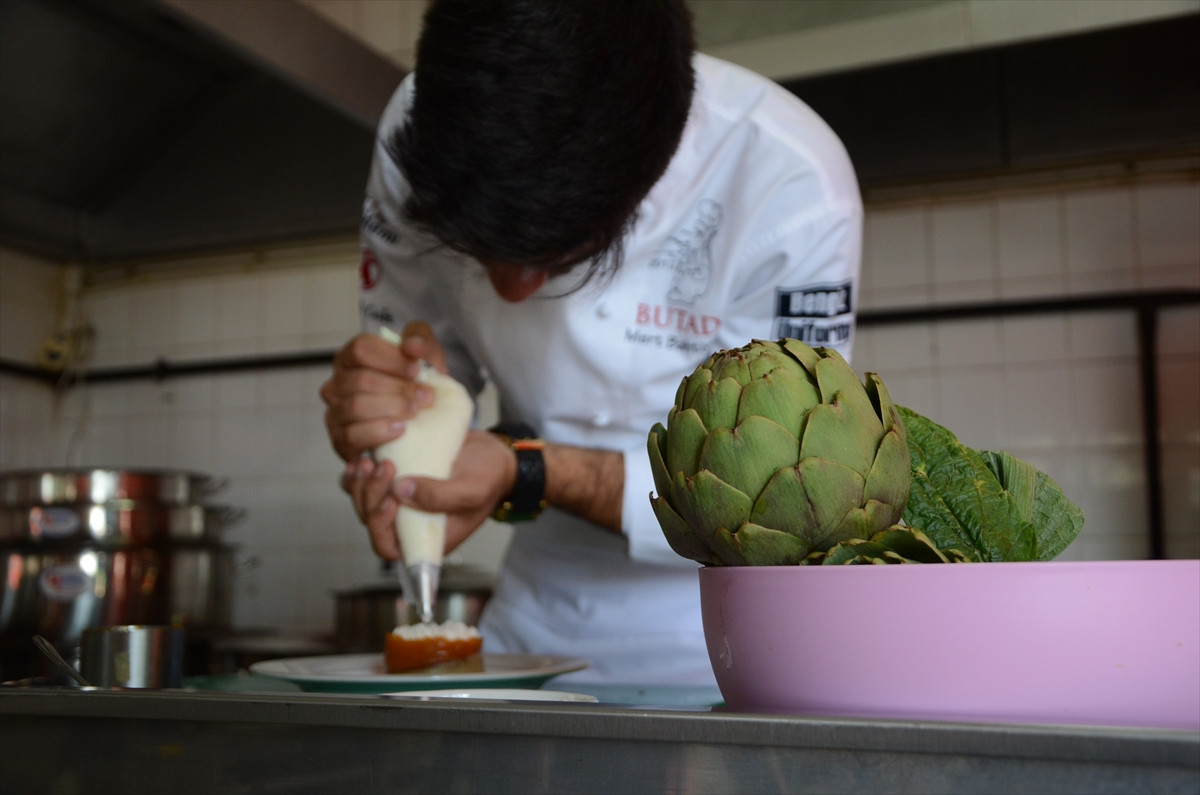 BURSA (AA) - İSMAİL ERSAN - Türkiye'nin önemli enginar üretim merkezlerinden olan Bursa'nın merkez Nilüfer ilçesinin Hasanağa Mahallesi'nde yaşayan, bir lisenin aşçılık bölümü mezunu Mert Bahtiyar (18), "karaciğer dostu" olarak bilinen enginardan yaptığı tatlının, "Gaziantep baklavası" gibi ün yapması için çalışıyor.