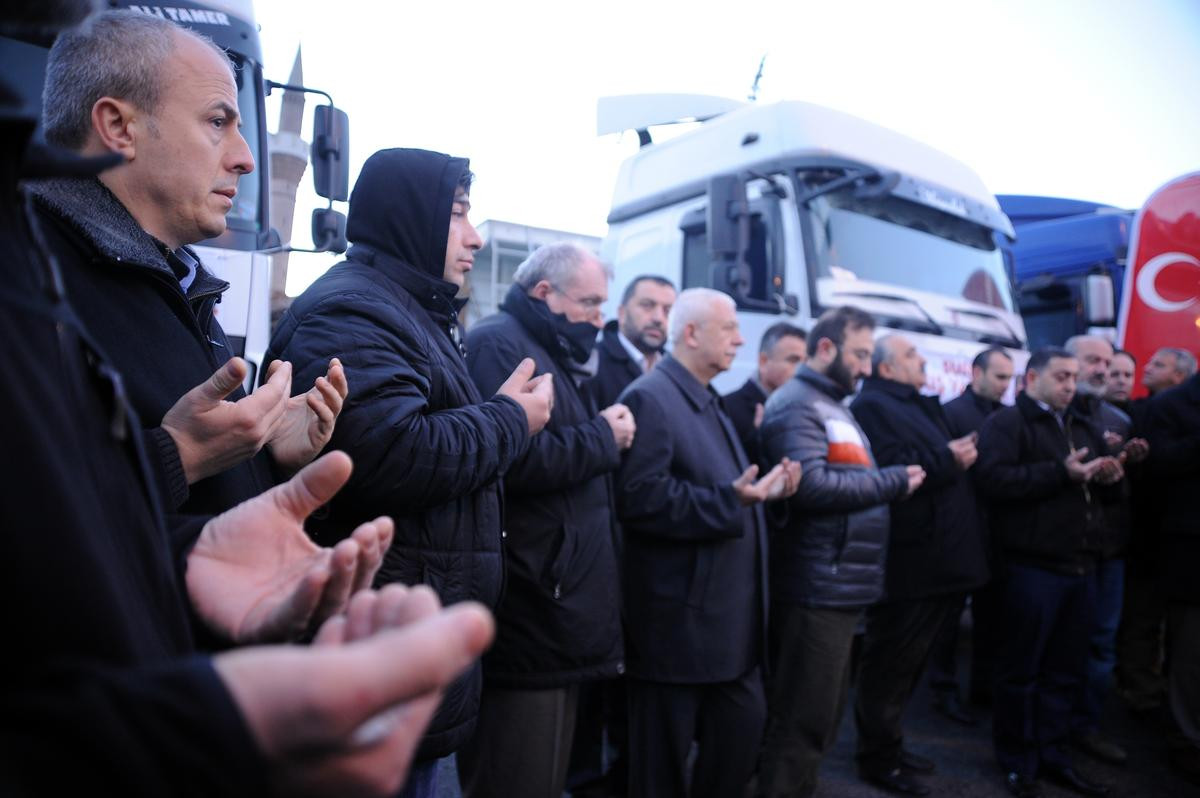 Konuşmaların ardından dualarla yola çıkan tırlar, Suriye'deki Türkmenlere ulaştırılmak üzere Hatay'a uğurlandı.