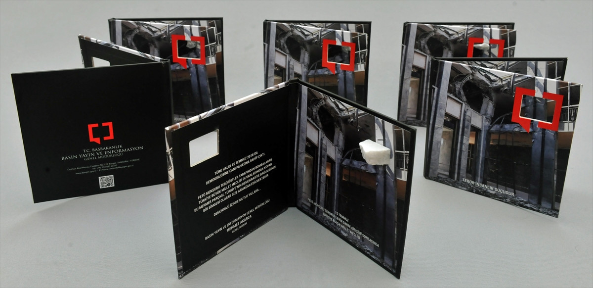 ANKARA (AA) - Başbakanlık Basın Yayın ve Enformasyon Genel Müdürlüğü (BYEGM), Fetullahçı Terör Örgütünce (FETÖ) 15 Temmuz darbe girişimi sırasında atılan bombalar nedeniyle TBMM'nin yıkılan duvarlarından alınan taşları, "Türkiye'nin demokrasiye bağlılığının simgesi" olarak, yılbaşı tebrik kartlarıyla dünyanın dört bir yanına gönderdi.