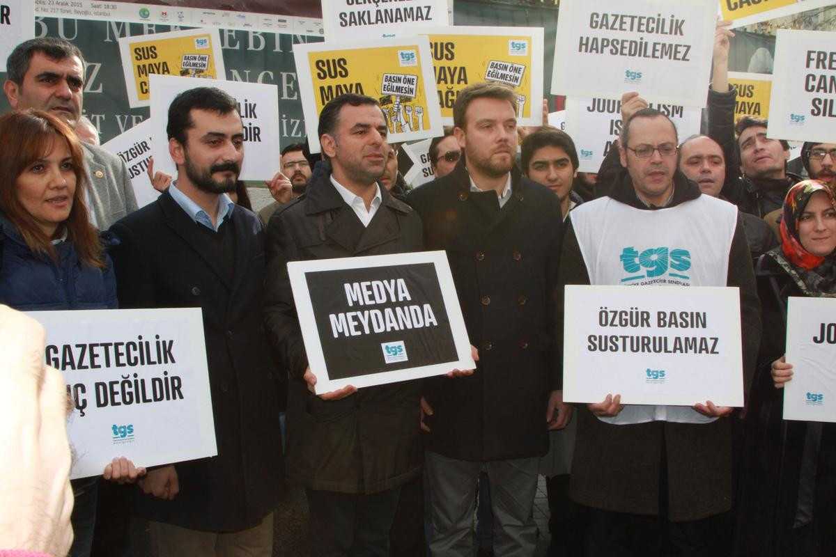 İSTANBUL (AA) - Türkiye Gazeteciler Sendikası (TGS) üyesi bir grup, Cumhuriyet Gazetesi Genel Yayın Yönetmeni Can Dündar ve gazetenin Ankara temsilcisi Erdem Gül'ün tutuklanmasını protesto etti.