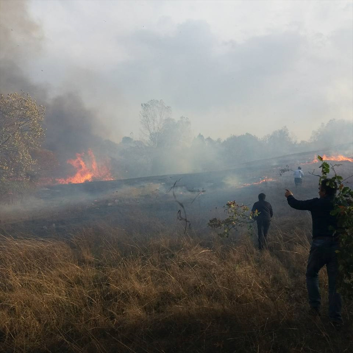 Rüzgarın da etkisiyle kısa sürede büyüyen yangın, tarım alanlarındaki meşe ağaçlarına sıçradı.