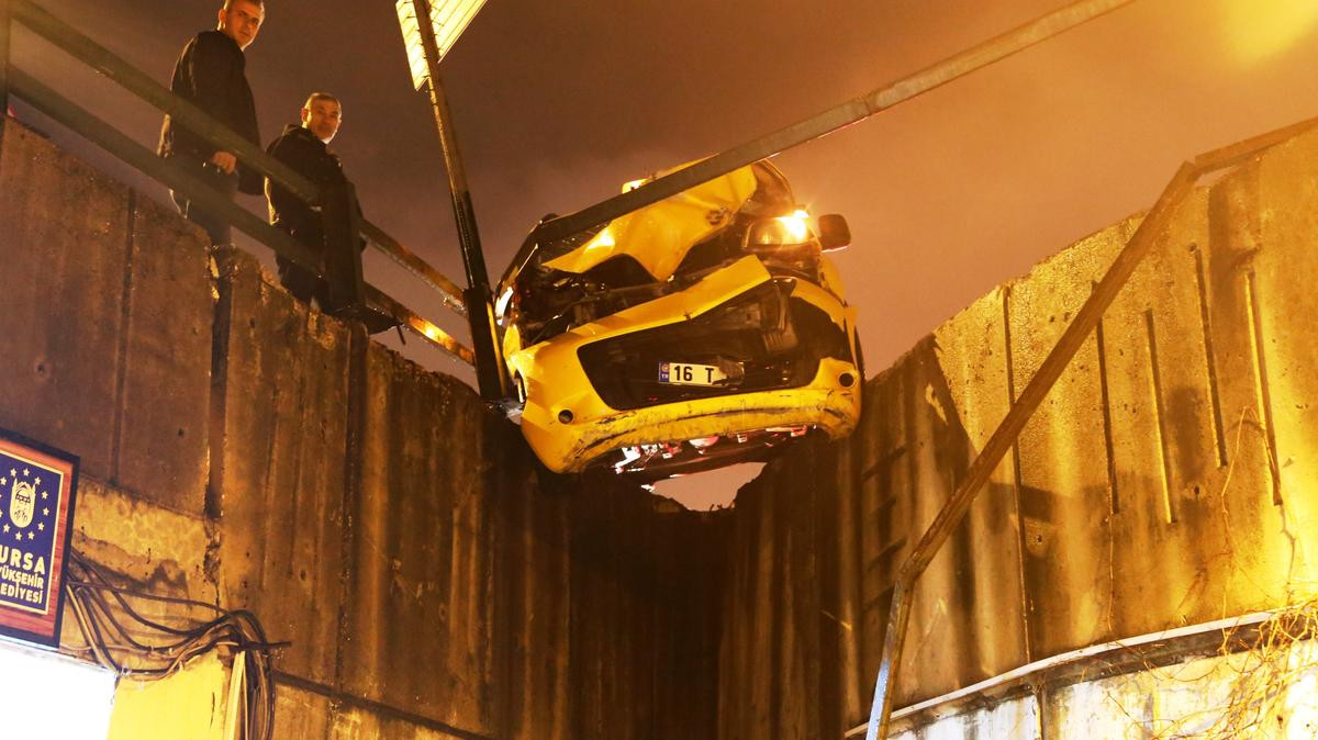 BURSA (AA) - Bursa'nın merkez Osmangazi ilçesinde bir taksi, çarptığı köprülü kavşağın korkuluklarında asılı kaldı.