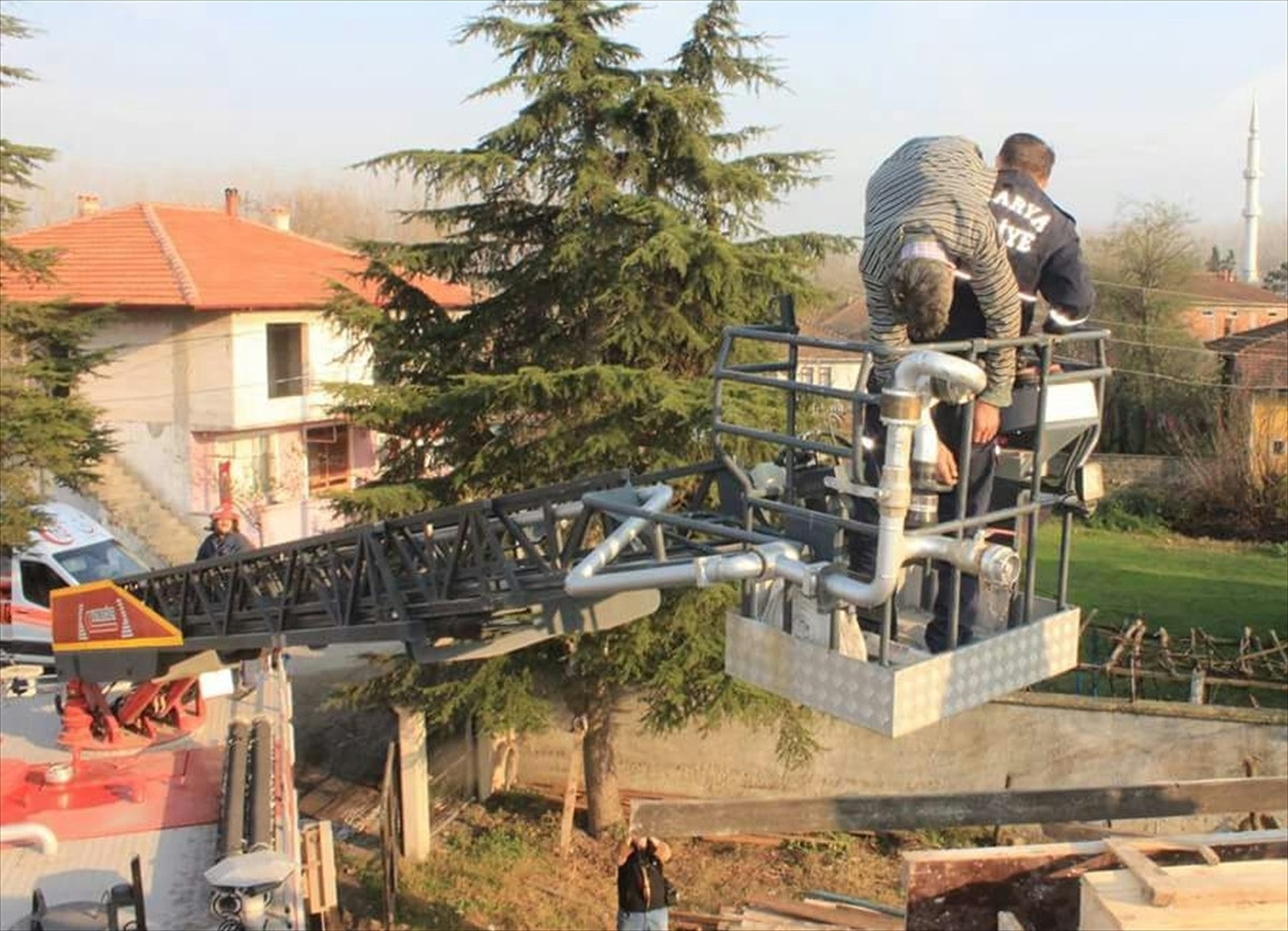 Sakarya Büyükşehir Belediyesine bağlı Akyazı itfaiye ekipleri, çatıya merdiven uzatarak, Halis Tunç’u yere indirdi.