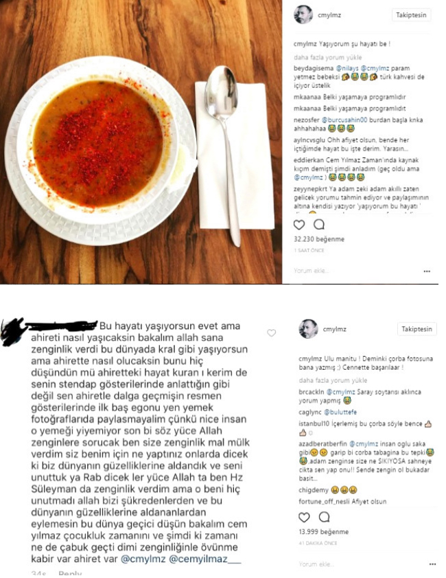 Fotoğrafının altına bir takipçisi "o çorbayı içemeyenler var, yaşa bakalım ahirette ne yapacaksın" dedi. Bunun üzerine Yılmaz, takipçisini ti'ye alan videolar ve fotoğraflar paylaştı.