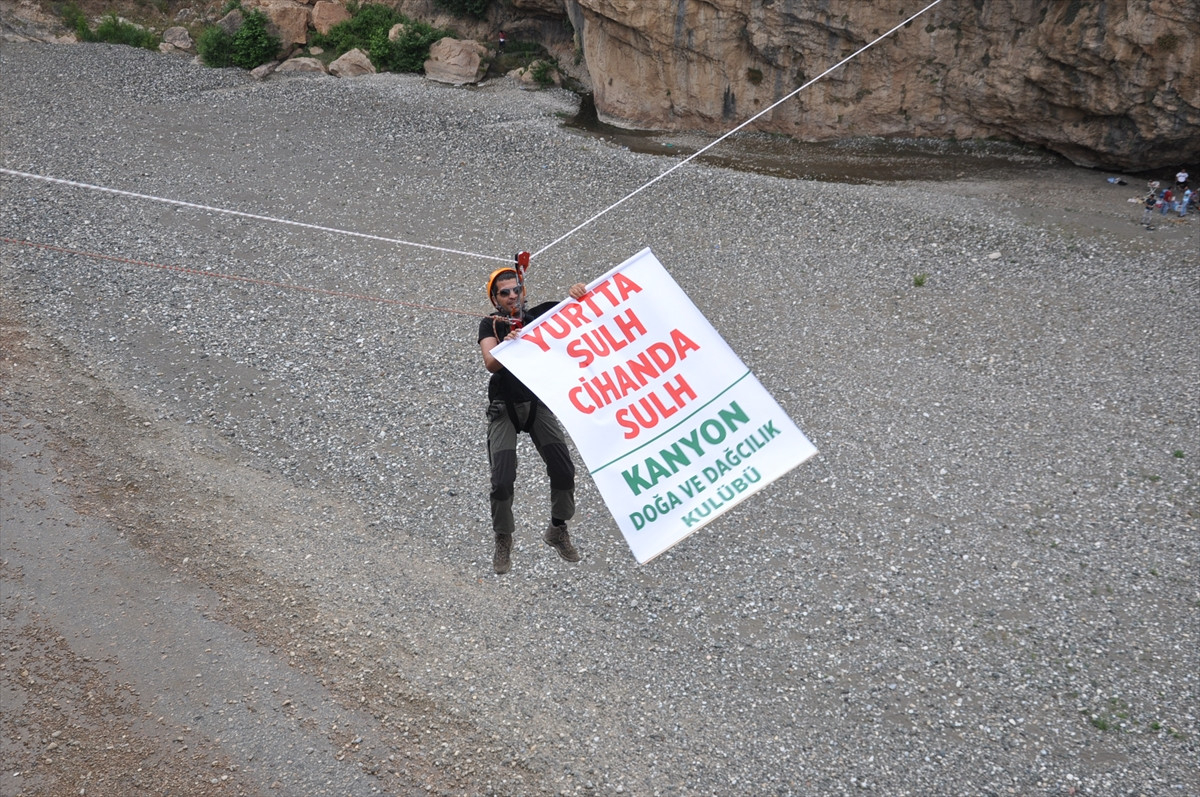 Adıyaman Kanyon Doğa Dağcılık Kulübü Başkanı Mehmet Küçükkelepçe, 100 metre yüksekliğinde gerçekleştirdiği kanyon geçişi sırasında Mustafa Kemal Atatürk’ün "Yurtta Sulh, Cihanda Sulh" sözünün yazılı olduğu afişi açtı.