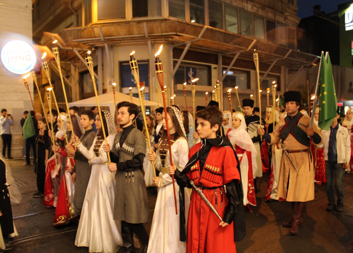 İstiklal Caddesi'nde Galatasaray Lisesi önünde toplanan Çerkesler, slogan atarak yürüyüşe geçti. Geleneksel Çerkes kıyafetleri giyen ve ellerinde meşalelerle yürüyen gruptakiler, "Büyük Çerkes soykırımını unutturmayacağız" ve "Katil Rusya Kafkasya’dan defol" şeklinde slogan attı.