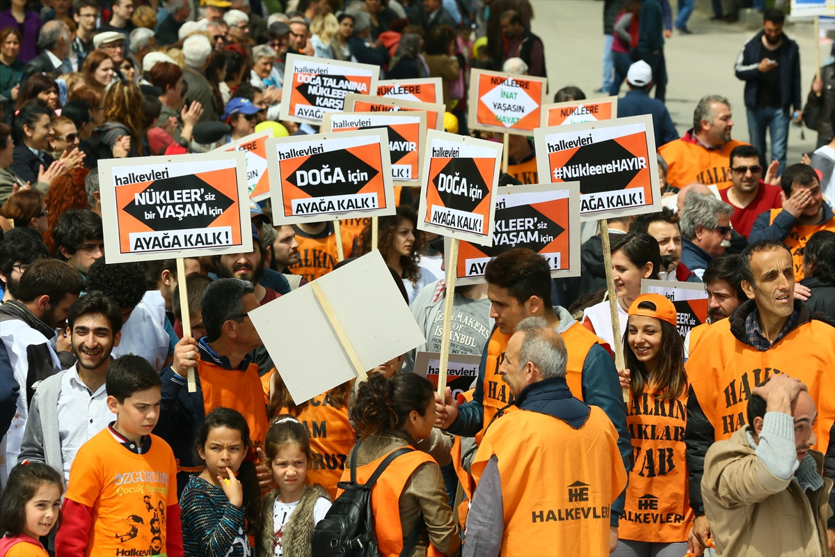 Tarihi Cezaevi önünde toplanan grup, ellerindeki "Yaşamı yok eden enerjilere hayır", "Nükleere inat, yaşasın hayat", "Nükleer santral istemiyoruz" yazılı dövizlerle sloganlar atarak, Sakarya Caddesi'nden yürüyerek Uğur Mumcu Meydanı’na ulaştı. Alana, burada kurulan polis arama noktalarından alınan grup, bir süre müzik eşliğinde halay çekti, sloganlar attı. Bazı balıkçıların da teknelerine nükleer karşıtı dövizler asarak, protestolara destek verdikleri gözlendi.
