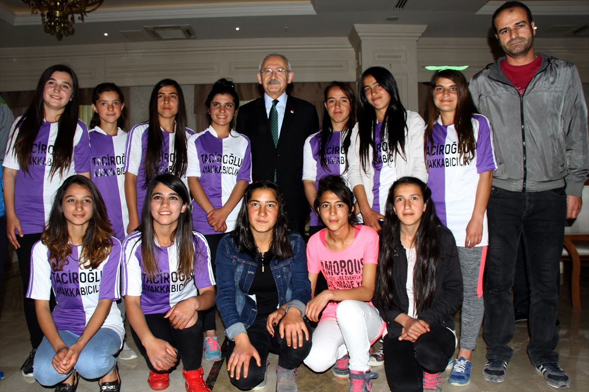 CHP Genel Başkanı Kılıçdaroğlu, toplantı öncesinde kentte düzenlenen okullar arası futbol turnuvasında birinci olan Mustafa Cengiz Ortaokulu kız futbol takımı sporcuları tarafından çiçeklerle karşılandı.