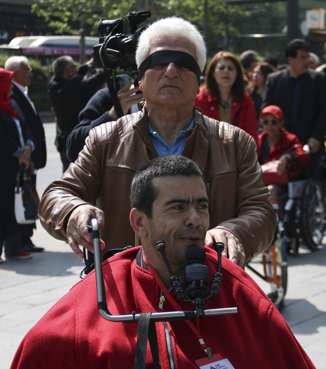 ANKARA (AA) - Cumhuriyet Halk Partisi (CHP) Ankara İl Başkanlığı üyeleri, milletvekilleri ve engelli vatandaşlar, Kızılay'dan il başkanlığı binasına kadar gözleri kapalı yürüdü.