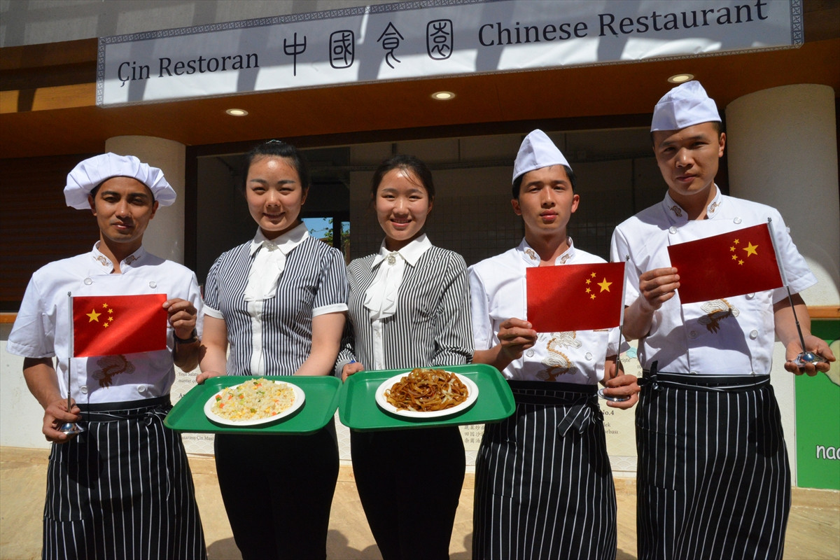 EXPO 2016 Antalya'nın resmi katılımcıları arasında yer alan Çin, hem bahçesiyle hem de yöresel lezzetleriyle ziyaretçilerin ilgi odağı oluyor. Botanik zenginliğinin yanı sıra mutfak kültürüyle de EXPO 2016 Antalya'da yer alan Çin, kır aktivite alanının yanına açtığı restoranda ülkeye özgü erişte, pilav, tavuk ve et yemekleri ve Pekin ördeği ile ülkenin mutfak kültürünü tanıtıyor. Çin'den gelen aşçı ve servis elemanları ziyaretçilere çeşitli sunumlar gerçekleştiriyor. Çin yemeklerini kendilerine has pişirme teknikleriyle hazırlayan aşçılar, müşterilere en lezzetli yemekleri hazırlamak için hünerlerini sergiliyor. Restorana gelen müşterilere yeşil çay da ikram ediliyor. Restoranın sahibi Bowen Lıu, EXPO 2016 Antalya'da Çin yemeklerini tanıtma fırsatı buldukları için mutlu olduklarını belirterek Türk insanının son yıllarda Çin yemeklerini daha yakından tanıdığını vurguladı. Türkiye'de lezzetlerini daha iyi tanıtabilmek için çalışacaklarının belirten Bowen Lıu "buraya gelen insanlar Çin'in orijinal yemeklerinin tadını deneyebilir. Mesela ördek, erişte gibi yemeklerimiz var. Bütün aşçı ve servis elemanlarımız Çin'den geldi. Türk halkı için en iyi yemekleri yapacağız" dedi.