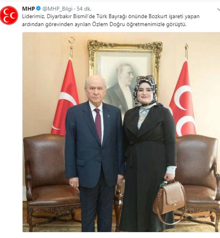 Diyarbakır'daki bir okulda Türk bayrağı önünde bozkurt işareti yapıp sosyal medya hesabından paylaşan ve gelen tepkiler üzerine görevinden ayrılan Özlem Doğru, MHP lideri Devlet Bahçeli'yi ziyaret etti.