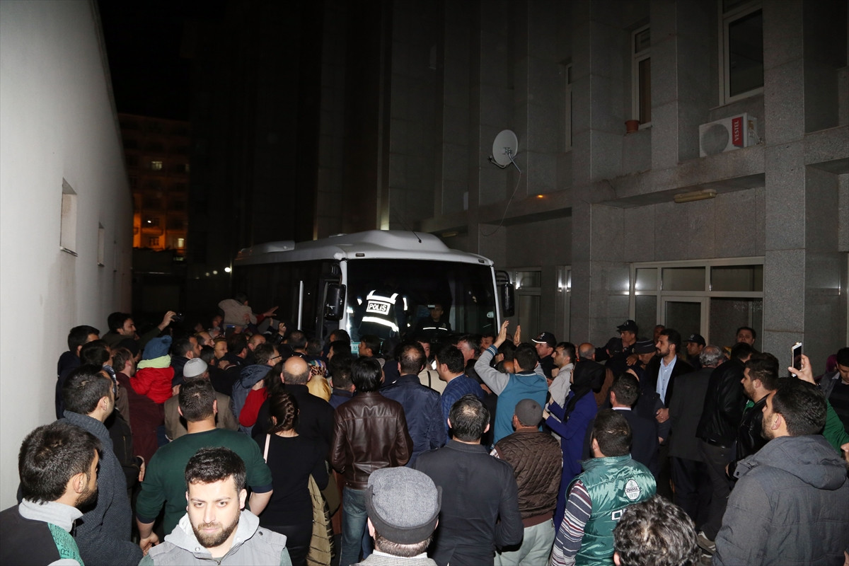 Zanlılar, adliye önünde bekleyen aileler ve vatandaşlar nedeniyle adliyenin ön kapı yerine, alt kattaki otopark girişinden çıkarılmak istendi. Bunu fark eden grubun, otoparka inerek tutuklananlara alkış ve sloganlarla destek verdikleri görüldü. Grubun, zanlıların cezaevine nakledileceği İl Emniyet Müdürlüğüne ait midibüsün önünü kesmesi üzerine polis ekipleri müdahale etti. Grup dağıldıktan sonra midibüs adliyeden ayrıldı.