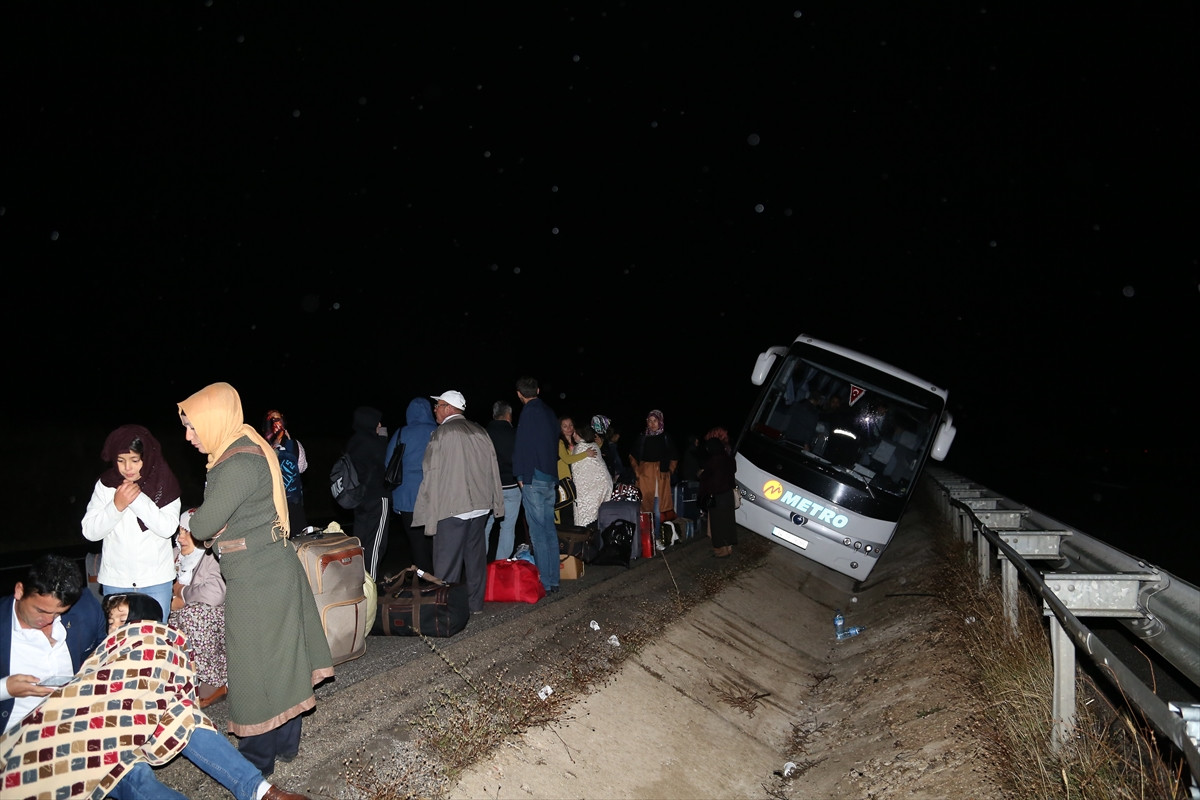 Refüjdeki bariyerlere yaslanarak durabilen araçtaki sürücü Toy ile 44 yolcu, kazayı yara almadan atlattı.