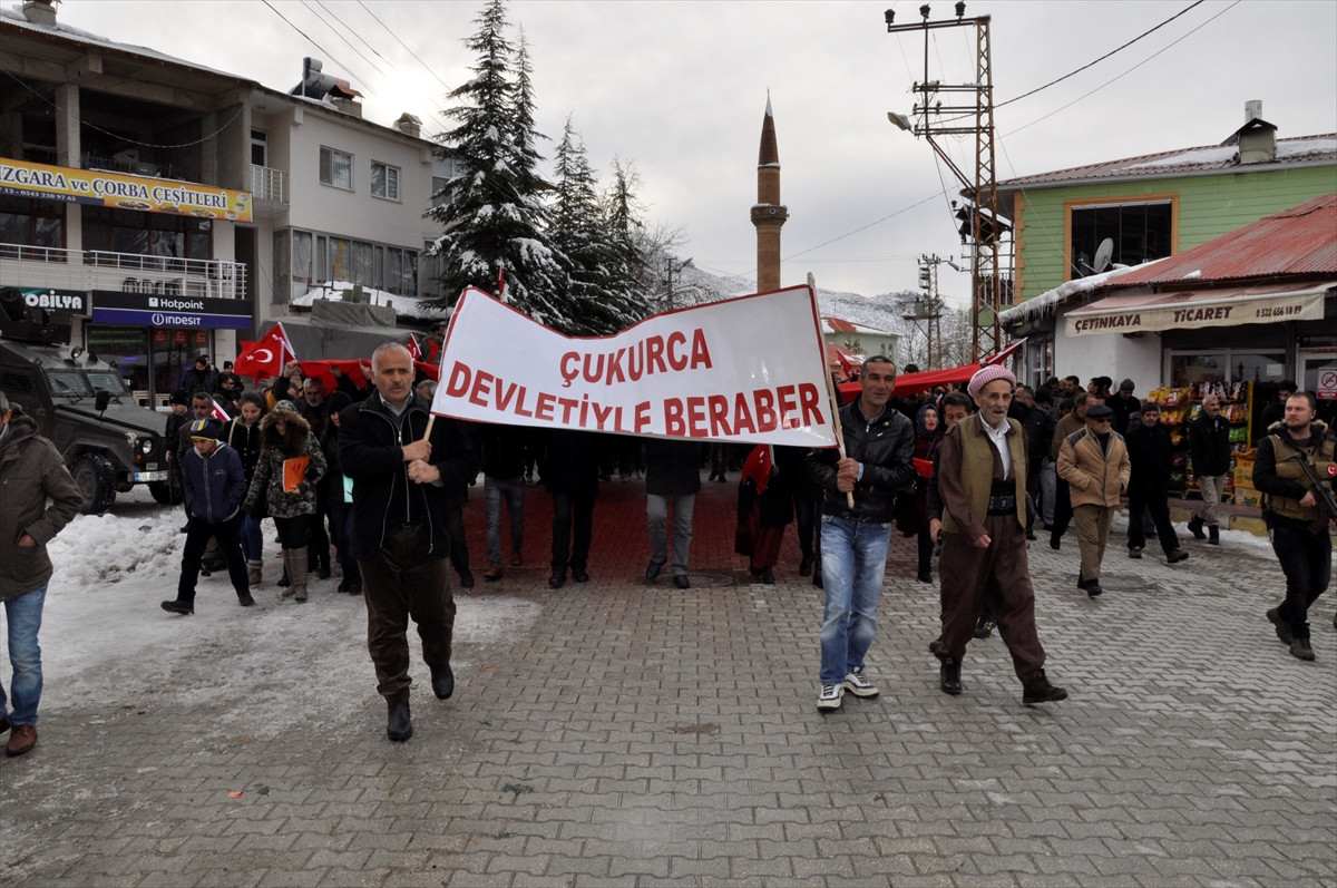Çukurca Belediye Meydanı'nda bir araya gelen çok sayıda vatandaş, ellerinde Türk bayraklarıyla "Çukurca halkı devletin yanında", "kahrolsun PKK", "şehitler ölmez, vatan bölünmez" ve "Türk Kürt kardeştir PKK kalleştir", "akan kan bayrak için" sloganları atarak tekbirler eşliğinde Cumhuriyet Caddesi'ne yürüdü.