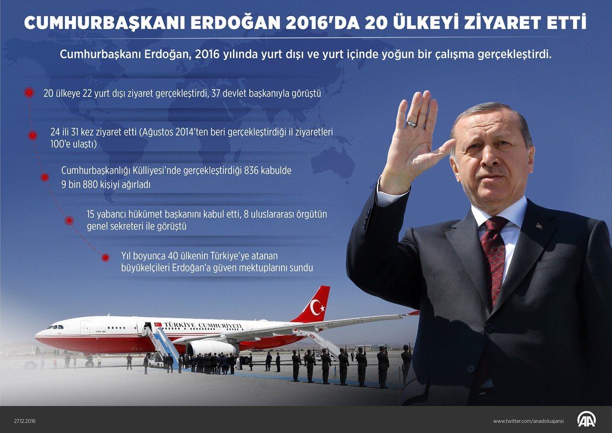 AA muhabirinin derlediği bilgilere göre, Cumhurbaşkanı Erdoğan, 2016 yılında yurt dışı ve yurt içinde yoğun bir çalışma gerçekleştirdi.