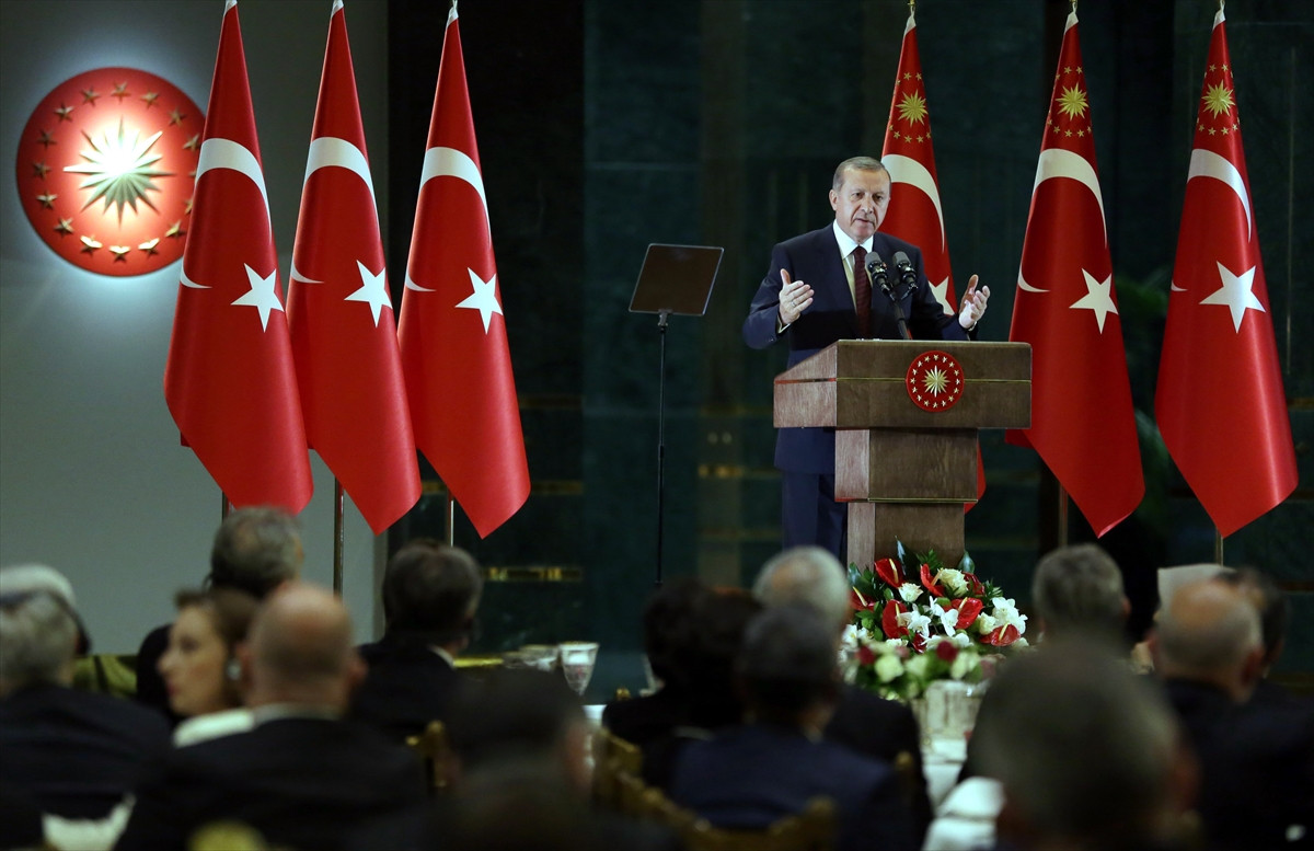 "Açlıktan bitap bir şekilde, önündeki defter yaprağına bir an önce ölmeyi ve cennete gidip yemek yemeği dileyen yazılar yazıp, tabut resmi yapan Suriyeli kız çocuğunun acısını yüreklerimizde hissetmek zorundayız. Cansız bebeğin, sahillerimize vuran 'Aylan bebeğin' görüntüsünü, insanlık çok çabuk unuttu. Enkaz altından çıkartılan çocuk cesetleri artık haber bile olmuyor. Mardin'de teröristlerin daha doğmadan annesinin karnında katlettiği bebek, maalesef dünyanın gündemine giremiyor. İnsanı insan yapan değerleri, yani vicdanı, ahlakı, sevgiyi bir kenara bıraktığımızda dünyada geriye sadece taş ve demir yığınlarından ibaret yapılar, araçlar kalıyor. Ben buradan siz büyükelçiler huzurunda tüm dünyaya seslenerek diyorum ki gelin insanlığımıza hep birlikte sahip çıkalım. Zulme, kimden gelirse gelsin, kime yönelik olursa olsun asla rıza göstermeyelim. Teröriste, kimliğine, söylemine, kökenine, inancına bakmaksızın tavır koyalım. Mağdurlara, mazlumlara, gariplere hep birlikte kol kanat gerelim. İşte o zaman dünyanın hepimiz için çok daha güzel, çok daha yaşanabilir yer haline geldiğini göreceğimizden şüphe duymuyorum. Geldiğimiz nokta itibarıyla dünyanın güç oyunlarına değil, insanlığın sorunlarına çözüm bulunmasına ihtiyacı vardır. Sizlerin aynı duygular ve düşünceler içerisinde olduğunuza inanıyorum."