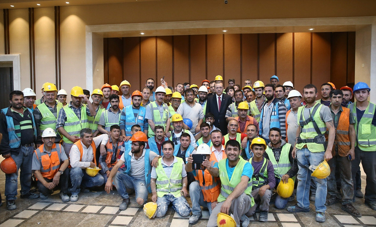 Cumhurbaşkanı Erdoğan, camiden ayrılırken inşaatta çalışan işçilerle hatıra fotoğrafı çektirdi.