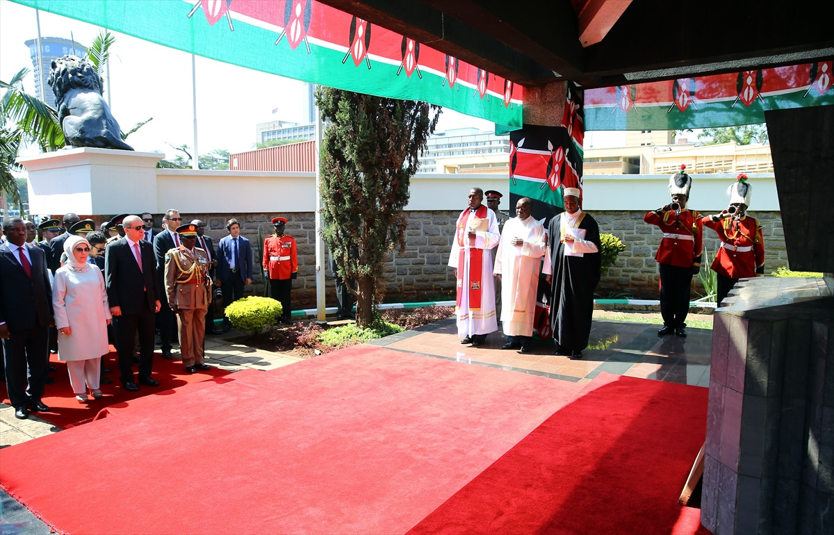 Erdoğan, ilk olarak Kenya'nın kurucusu ve ilk devlet başkanı Jomo Kenyatta'nın mozolesine çelenk koydu.