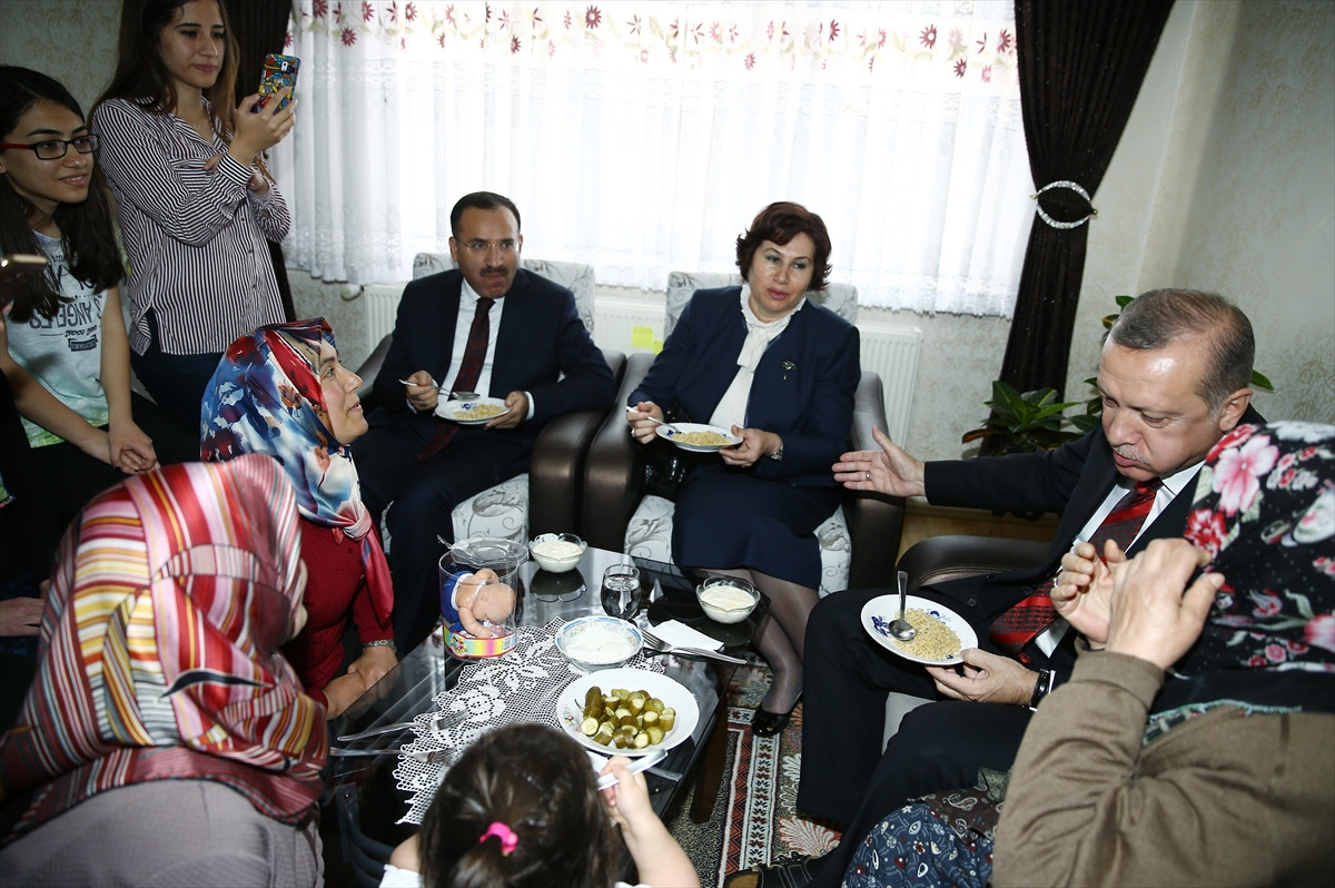 Dört çocuk sahibi Servet (43) ve Ayten (40) Güneş çiftini evlerinde ziyaret eden Erdoğan, kendisine ikram edilen pilavdan yedi.