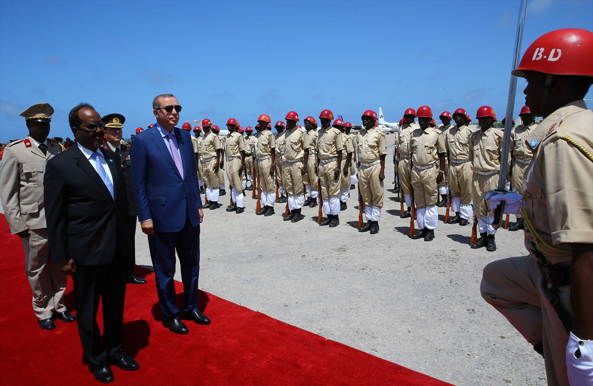 Erdoğan, Uluslararası Mogadişu Aden Abdelle Havaalanı'nda Somali Cumhurbaşkanı Hasan Şeyh Mahmud tarafından resmi törenle karşılandı.