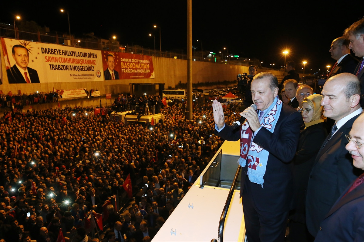 Tüm vatandaşları selamlayarak konuşmasına başlayan Cumhurbaşkanı Erdoğan, Trabzon'a tüm Konyalılarla birliğin, beraberliğin, dayanışmanın selamını getirdiğini belirterek, "Sizler aynen Konya'da olduğu gibi inanıyorum ki 15 Temmuz'daki o ruhun bugün yeni bir dirilişisiniz." ifadesini kullandı.