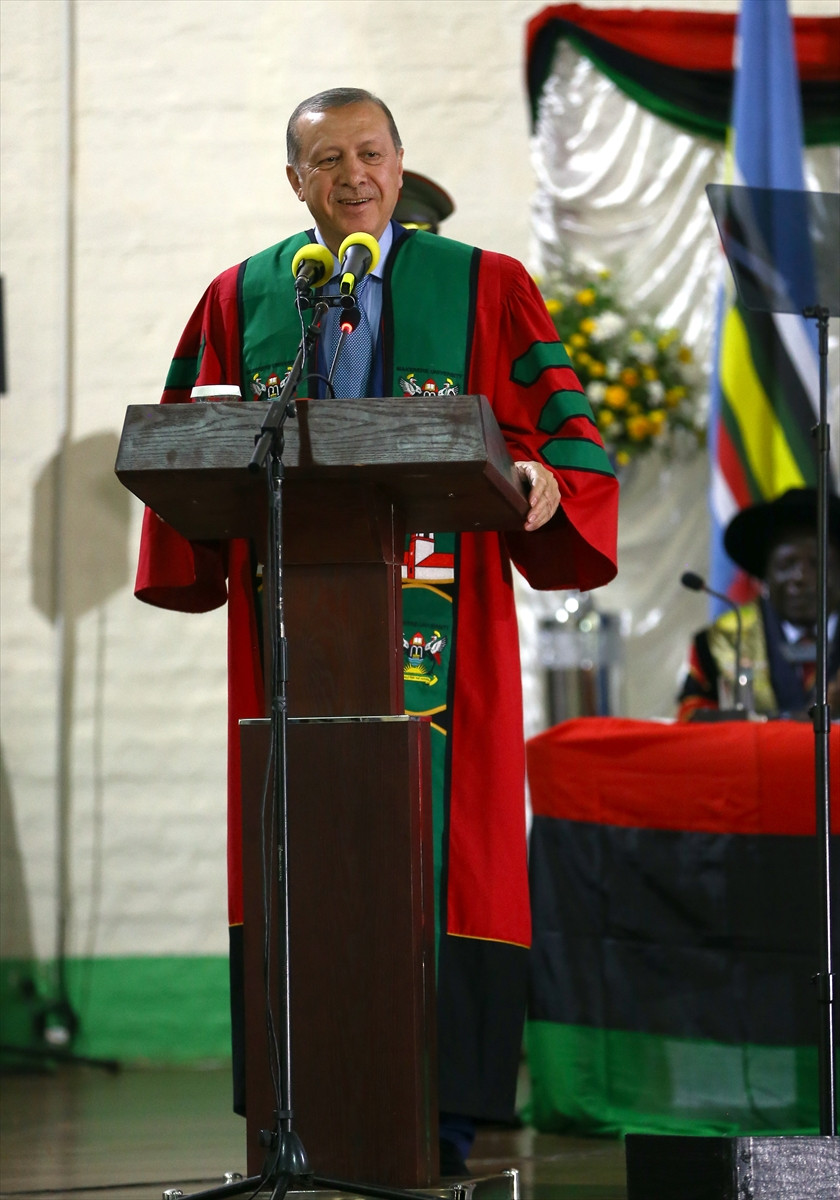 Uganda'ya resmi ziyarette bulunan Erdoğan'a, Uganda Makarere Üniversitesinde düzenlenen törenle fahri doktora verildi.
