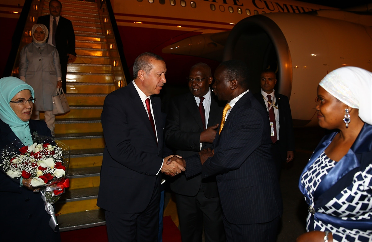 Erdoğan'ı Entebbe Havaalanı'nda Uganda Dışişleri Bakanı Sam Kutesa, Ugandalı Mihmandar Bakan -Toprak, İskan ve Şehircilik Bakanı Daudi Migereko, Uganda Protokol Genel Müdürü Charles Sentongo, Dışişleri Bakanı Mevlüt Çavuşoğlu, Ekonomi Bakanı Nihat Zeybekci, Türkiye'nin Kampala Büyükelçisi Ayşe Sedef Yavuzalp ve eşi Büyükelçi Osman Yavuzalp ile diğer ilgililer karşıladı.