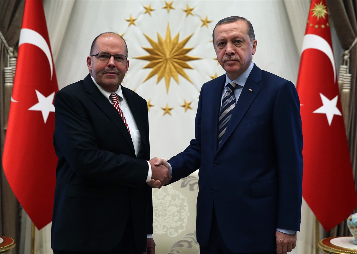 Elferts'in eşi ve bazı büyükelçilik mensuplarını Cumhurbaşkanı Erdoğan'a takdiminin ardından hatıra fotoğrafı çektirildi.