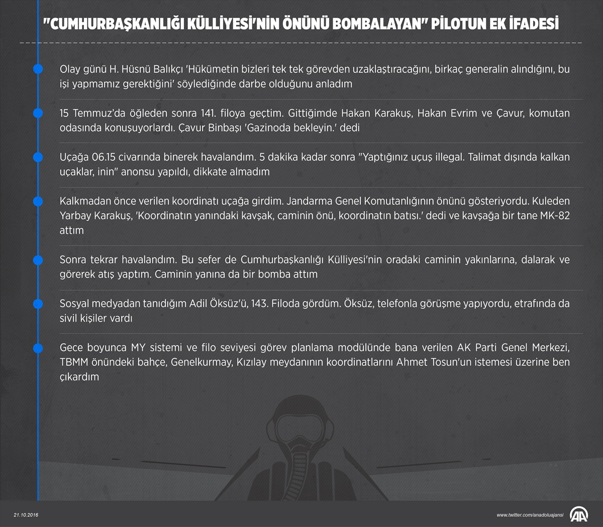 "Benden önce uçan pilotlar benzer şekilde uyarıldıklarını Yüzbaşı Ahmet Tosun'a söylediler. O da Ahmet Özçetin'e sordu. Onun 'Dikkate almayın.' şeklindeki uyarıları üzerine uçuşlar devam etti. Ben de bu nedenle uyarıyı dikkate almadım. Kalkmadan önce verilen koordinatı uçağa girdim. Jandarma Genel Komutanlığının önünü gösteriyordu. Benim uçağımda 'sniper pod' yoktu. 20 bin fitte uçtum. Telsiz filo da çalışmadığı için kuleden Yarbay Hakan Karakuş, 'Koordinat üzerinde beklemeye devam et. Sonra talimatı vereceğiz.' dedi. Sonra 'Hedefleri veriyoruz.' diyerek, bana talimatlarda bulundu. 'Koordinatın yanındaki kavşak, caminin önü, koordinatın batısı.' diye tariflerde bulundu. Ben, 'Batı'da bir şey yok.' deyince, Karakuş diğerlerine 'Atış serbest.' dedi ve kavşağa bir tane MK-82'yi görerek ve dalarak atış yaptım. Sonra tekrar havalandım. Bu sefer de Cumhurbaşkanlığı Külliyesi'nin oradaki cami yakınlarına dalarak ve görerek, atış yaptım. Bu sırada kuleden Karakuş ile irtibat halindeydim. Onun talimatıyla atış yaptım. Caminin yanına da bir bomba attım. Daha sonra Erzurum'dan kalkan uçaklar beni önlemeye geldiler. Beni uyararak, üssüme dönmem gerektiğini belirttiler. Uçtuğum uçakta, başka uçakların bana kilitlendiğini gösteren sistem yoktu. Muhtemelen diğer uçaklar bana kilitlenmişti. Bunu yakın uçmalarından anladım. Ben de durumu Karakuş yarbaya bildirdim. Karakuş yarbay da inmemi söyledi. Bunun üzerine üsse döndüm.