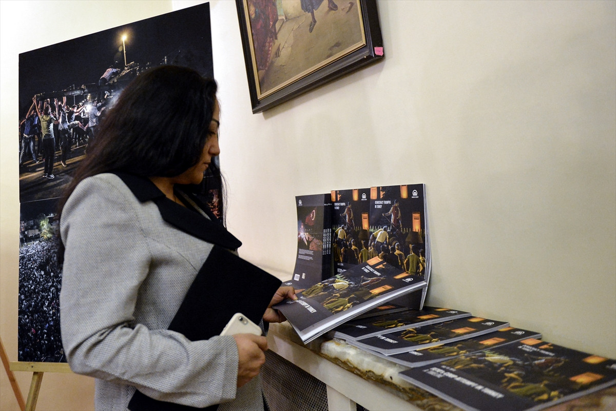 Resepsiyonda sergilenen Anadolu Ajansı muhabirlerinin 15 Temmuz darbe girişimine ilişkin fotoğrafları ile "Dakika Dakika FETÖ'nün Darbe Girişimi" isimli kitap, davetlilerin ilgisini çekti.