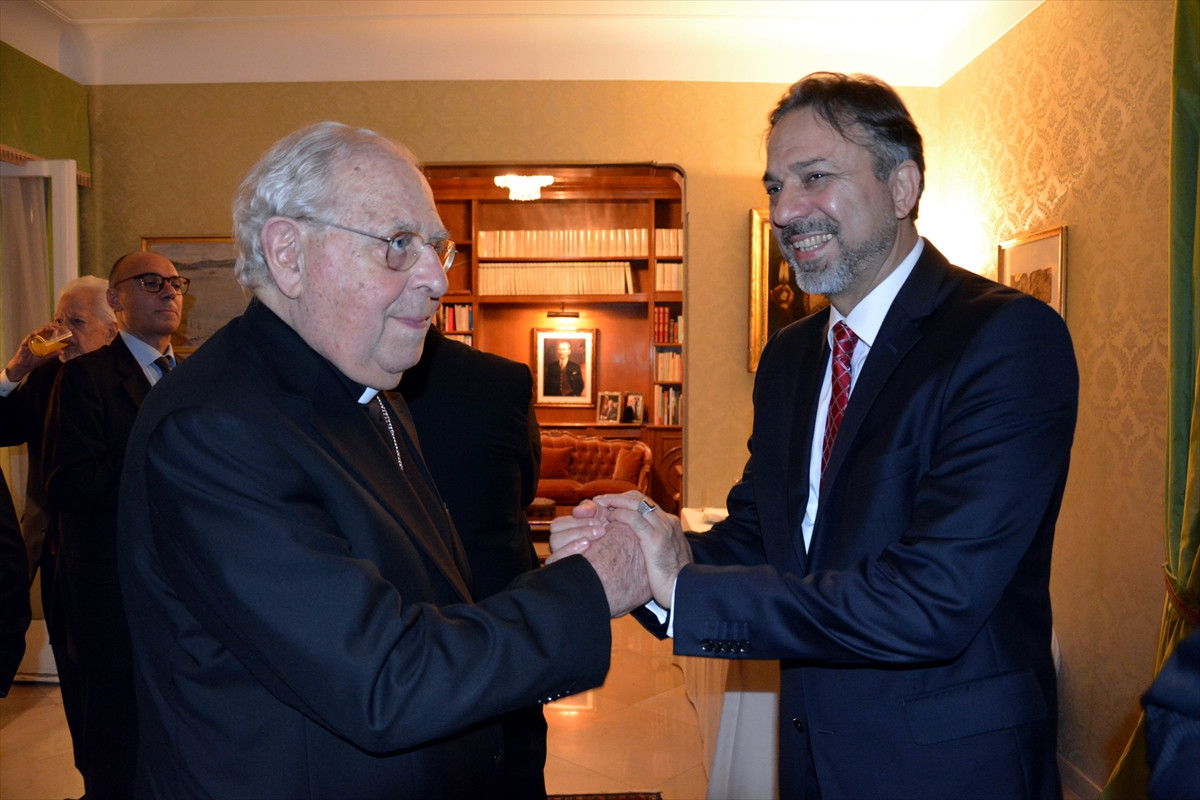Türkiye’nin Vatikan Büyükelçisi Prof. Mehmet Paçacı’nın ev sahipliğinde düzenlenen resepsiyon öncesi Paçacı ve Elçi Müsteşar Celal Doğan konukları kapıda karşıladı.