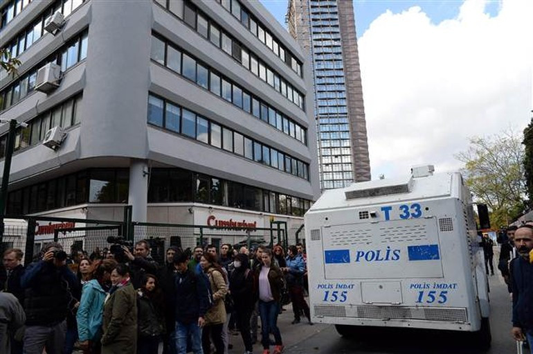 Ellerinde özgür basın susturulamaz dövizleri olan ve slogan atan gruplar gazetenin önünde bulunan İstiklal Caddesi’ni doldurmaya başladı. Bu arada polis caddeyi araç trafiğine kapattı. Gazete binasının yakınına TOMA ve Çevik kuvvet ekipleri geldi.