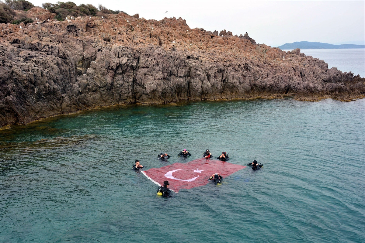 Ayvalık'a gelen Beykoz Dalış Kulübü üyesi 15 kişi, su altında ve yüzeyinde 8 metrekarelik Türk bayrağını açıp şehitleri andı, terör olaylarına tepkilerini dile getirdi.