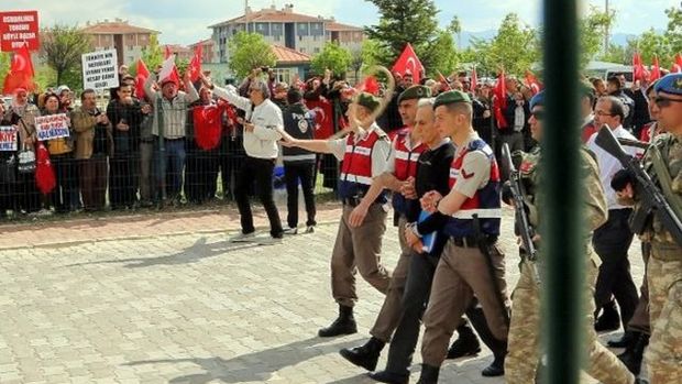 ÖZTÜRK VE DİĞER DARBECİLERİN MAHKEMEYE GİRİŞİNDE URGANLI PROTESTO