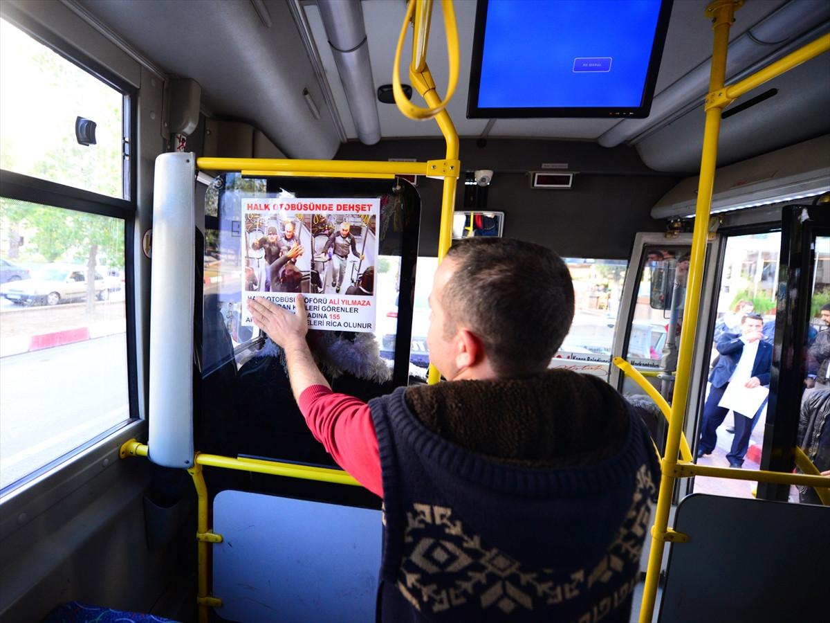 ANTALYA (AA) - Antalya'da 15 gün önce kimliği henüz belirlenemeyen iki kişi tarafından darbedilen otobüs şoförü Ali Yılmaz, kendisine saldıranların fotoğraflarının bulunduğu afişleri otobüs ve duraklara astı.