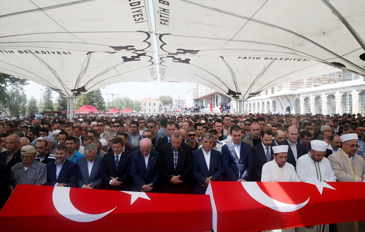 Demokrasi şehitlerinin Türk bayraklarına sarılı naaşları, Fatih Camisi'nde musalla taşına konuldu. Demokrasi şehitlerinin yakınları camide taziyeleri kabul etti.