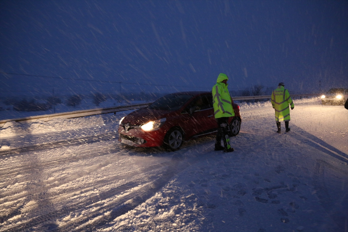 Karayolları ekiplerinin kar küreme ve tuzlama çalışması yaptığı yolda trafik ekipleri, kontrol noktalarında kar lastiği ve zinciri bulunmayan araçların geçişine izin vermiyor.