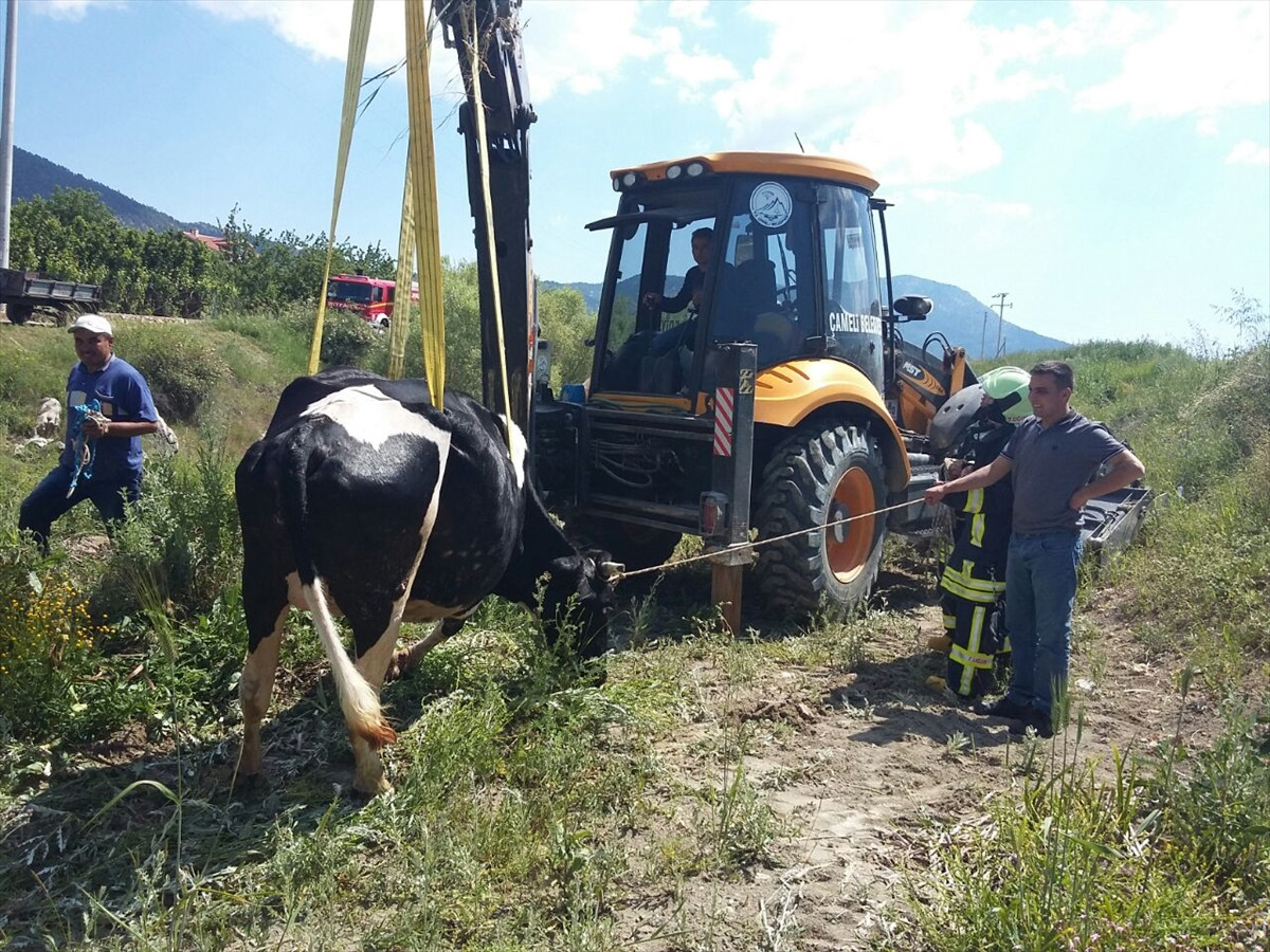 Denizli'nin Çameli ilçesinde sulama kanalına düşen inek, itfaiye ekibinin bir saatlik çabası sonucu kurtarıldı. Kızılyaka Mahallesi'nde Coşkun Özdemir'in tarlada otlattığı ineği, yaklaşık 2 metre derinliğindeki sulama kanalına düştü. Kanalın çamurlu zeminine saplanan inek, Özdemir ve çevredekilerin çabasına rağmen çıkarılamadı. İneğin kurtarılması için Denizli Büyükşehir Belediyesi İtfaiyesinden yardım istendi. Olay yerine giden ekipler, ineği halat yardımıyla kanaldan çıkardı.