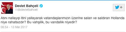 MHP Lideri Devlet Bahçeli Twitter hesabından açıklama yaptı. Bahçeli açıklamasındaHollanda'ya sert tepki göstererek şunları dile getridi: "On sekiz maddeden oluşan Türkiye Cumhuriyeti Anayasasında Değişiklik Yapılmasına Dair Kanun Teklifinin TBMM’de kabulü 21 Ocak 2017’dir.Cumhurbaşkanlığı Hükümet Sistemi’nin omurgasını teşkil eden anayasa değişikliğinin oylanacağı referandum tarihi de 16 Nisan 2017’dir.Değişen, değişecek olan rejim olmayıp hükümet sistemidir. Yeni sistem inşasının demokratik yollarla sağlanacak olması da büyük kazançtır.Ülke ve dünya gündemi Cumhurbaşkanlığı Hükümet Sistemi’ne kilitlenmiş,tartışmalar keskinleşmiş, tahrik ve tahripkar bakışlar kamçılanmıştır.İbn-i Sina boşuna söylememiş; hiç kimse görmek istemeyen kadar kör değildir. Şu sıralar bakan ama görmeyenlerin sayısı ne çoktur!Türk milleti meşru ve egemen iradesiyle hükümet etme sistemini değiştirecektir.
