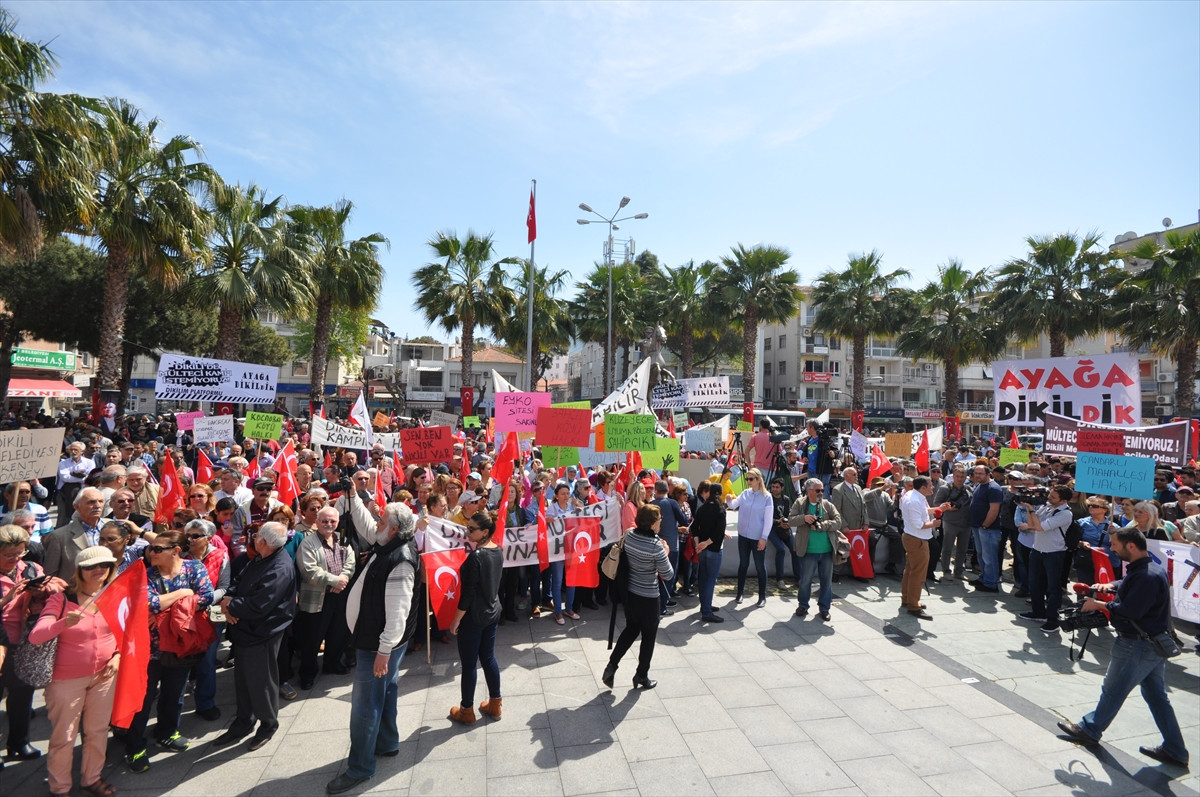 Dikili Cumhuriyet Meydanı'nda belediye ve çeşitli sivil toplum kuruluşlarınca "Mülteci Kampına Hayır" konulu bir protesto gösterisi düzenlendi.