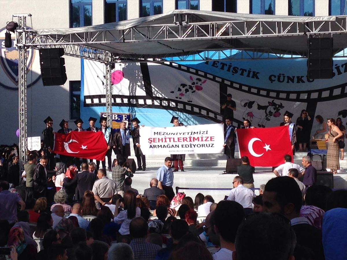 Diplomalarını almak için sahnede bulunan bazı öğrenciler, Türk bayrağı ve "Mezuniyetimizi şehitlerimize armağan ediyoruz" yazılı pankart açtı. Öğrencilerin alkışlandığı törende, "Şehitler ölmez, vatan bölünmez" sloganları atıldı.