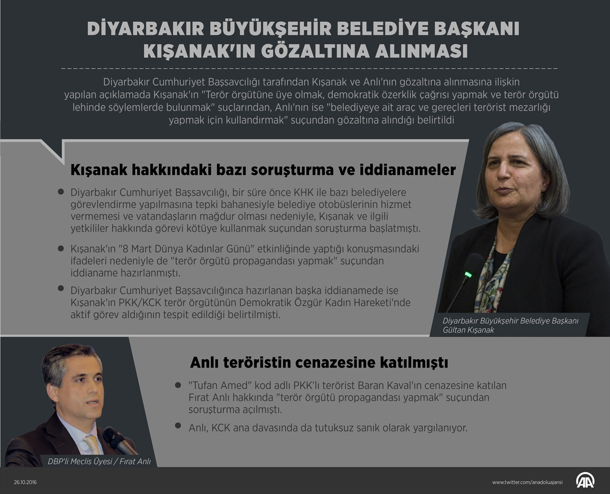 "PKK silahlı terör örgütünün çağrısı ve talimatları doğrultusunda düzenlenen nevruz etkinliklerinde terör örgütü lehinde söylemlerde bulunarak özerklik çağrısı yaptığı anlaşılmıştır. Belediye adına tescilli resmi araçları silahlı terör örgütü üyelerinin cenazelerine tahsis etmek suretiyle kullandırmak, yasa dışı toplantı ve gösteri yürüyüşlerine katılarak cebir ve şiddet olgusunu meşru gösterecek nitelikte örgüt lehine söz ve eylemlerde bulunmak ve benzeri çok sayıda eylemine yönelik olarak toplanan somut maddi her türlü şüpheden uzak kuvvetli suç şüphesi oluşturan deliller uyarınca Kışanak gözaltına alınmıştır."