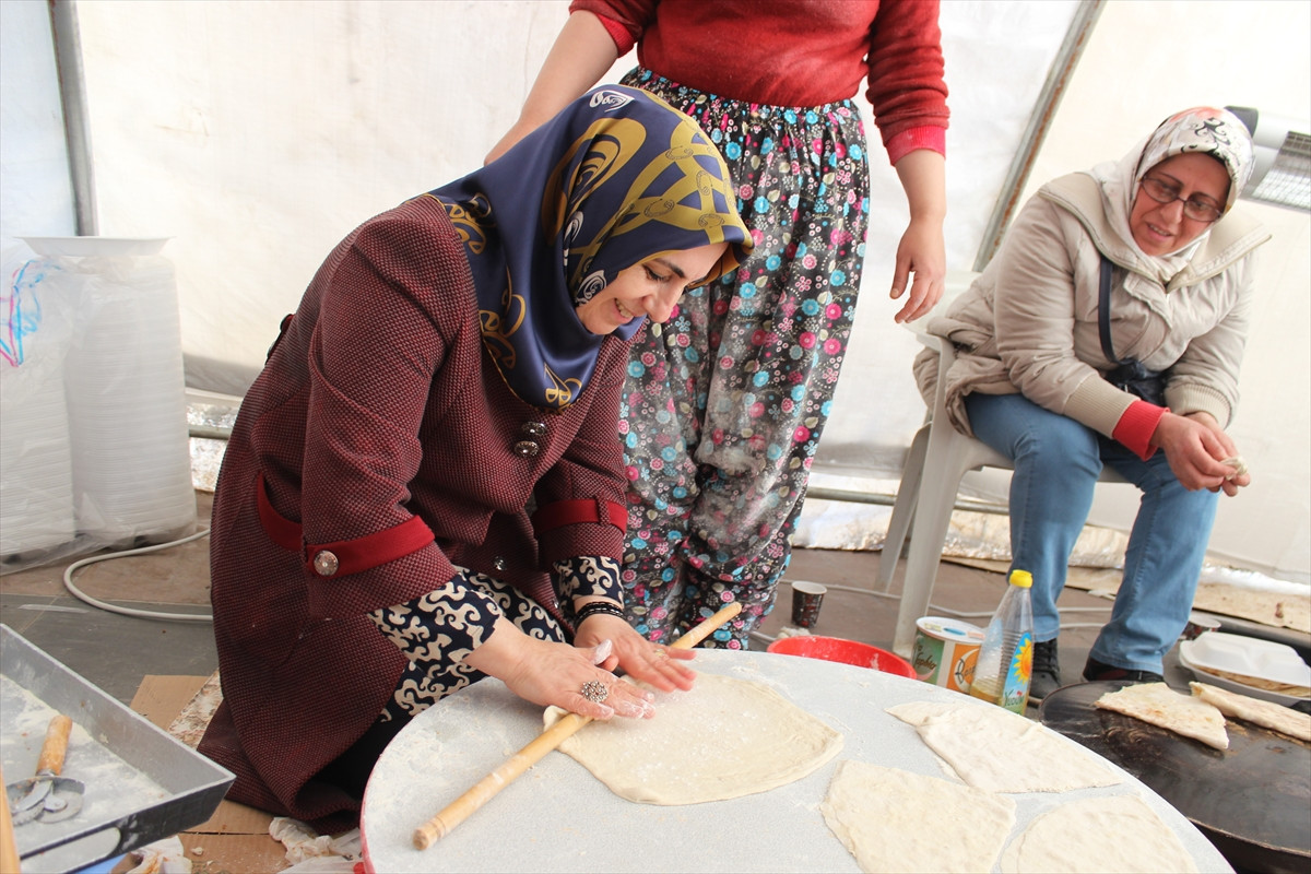 AK Parti Diyarbakır Kadın Kolları Başkanı Mukaddes Evsen, meydanda kurulan çadırda partili kadınlarla gözleme hamuru açtı.