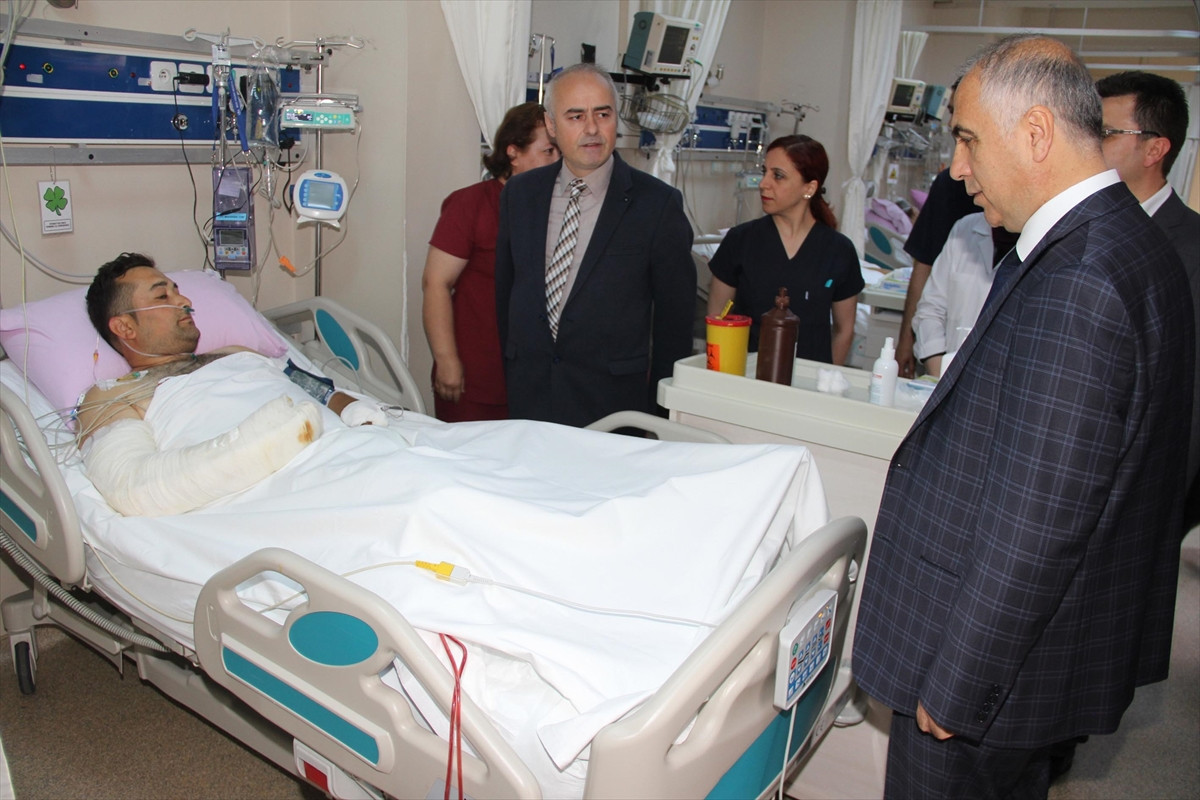 GİRESUN (AA) - Giresun Valisi Hasan Karahan, dün Doğankent ilçesinde Yaşmaklı Baraj sahasında meydana gelen patlamada yaralanan özel güvenlik görevlisi Abdurrahman Bekirefendioğlu'nu tedavi gördüğü hastanede ziyaret etti.