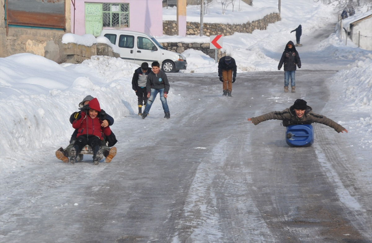 Öte yandan, merkeze 30 kilometre uzaktaki Yücetepe ve 15 kilometre mesafedeki Taşoluk köylerinde çocuklar, büyükleri için esarete dönüşen yağış ve soğuk havada birlikte kaymanın keyfini yaşıyor. Çocuklar, eğimli yolları adeta kayak pistine dönüştürüyor.