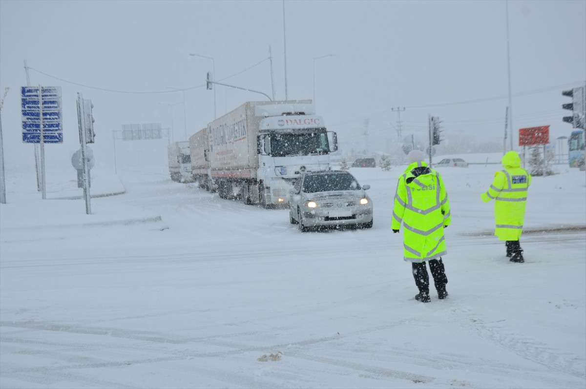 Yolun kar ve buzla kaplanması sebebiyle bölgede önlem alan trafik ekipleri, yoldaki ulaşım normale dönene kadar tır ve kamyon sürücülerini yol kenarındaki uygun alanlarda beklemeye aldı.