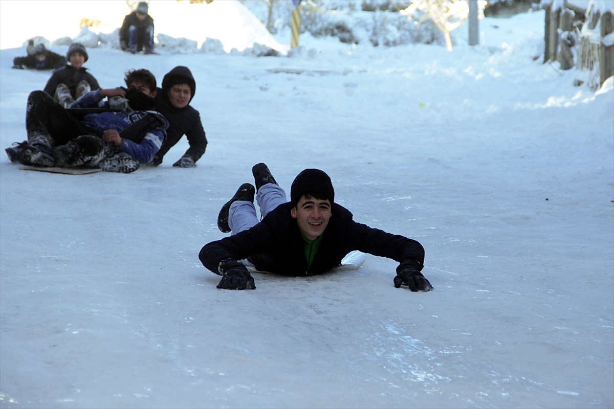 Olumsuz hava koşulları ve buzlanma nedeniyle Elazığ merkezde okulların tatil edilmesini fırsat bilen çocuklar, kartopu oynadı, tahta ve leğenle kayarak eğlendi.