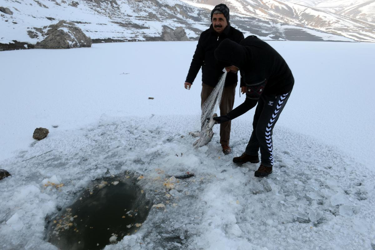 Kalınlığı 40 santimetreyi bulan buz tabakasını balta ve testere yardımıyla kıran balıkçılar, göl yüzeyine açtıkları deliklerden attıkları olta ve ağlarla balık tutmanın keyfini yaşadı.